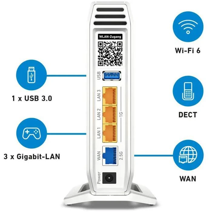 sonstiges: Firewall, integrierte DECT-Basisstation für bis zu 6 Schnurlostelefone (GAP/CAT-iq), Anrufbeantworter-Funktion, USB-Anschluss für Drucker oder Speichermedien, parallel 2 WLAN betreibbar mit Dualband-WLAN-AX + N für gleichzeitigen 2,4-GHz- und 5-GHz-Einsatz, konfigurierbarer Gastzugriff, WLAN-Eco für optimale Leistung bei minimalem Stromverbrauch