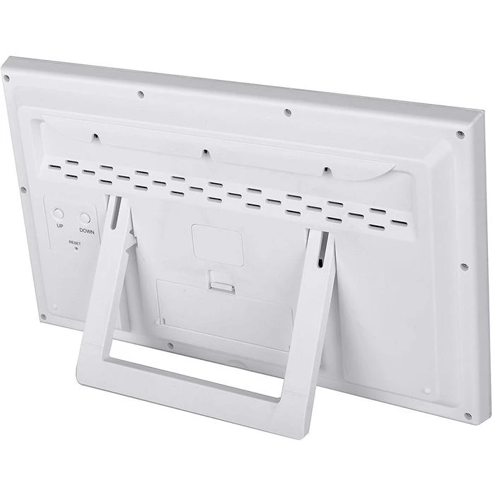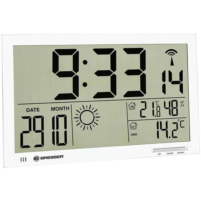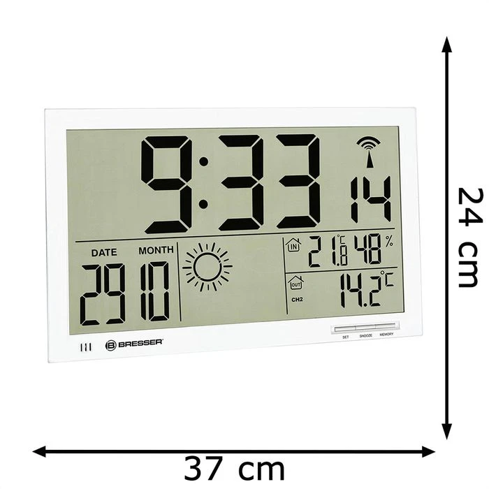 sonstiges: mit Zusatzsensor zur Messung der Außentemperatur, 1-Tages-Wettervorhersage mit Wettertrend-Symbolen, MIN-/MAX-Wertespeicherung für Temperatur und Luftfeuchtigkeit, Anzeige von Innentemperatur und -luftfeuchtigkeit, Anzeige des Datums (Tag und Monat), Weckerfunktion mit verschiedenen Schlummerintervallen (1 bis 20 Minuten), automatische Einstellung der Uhrzeit bei Inbetriebnahme und Umstellung von Sommer- und Winterzeit, Montage an der Wand oder zum Aufstellen