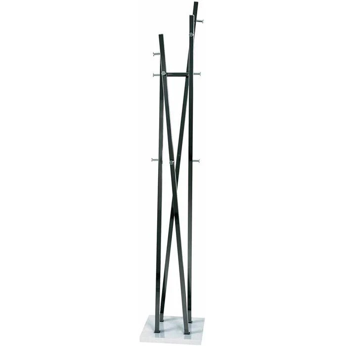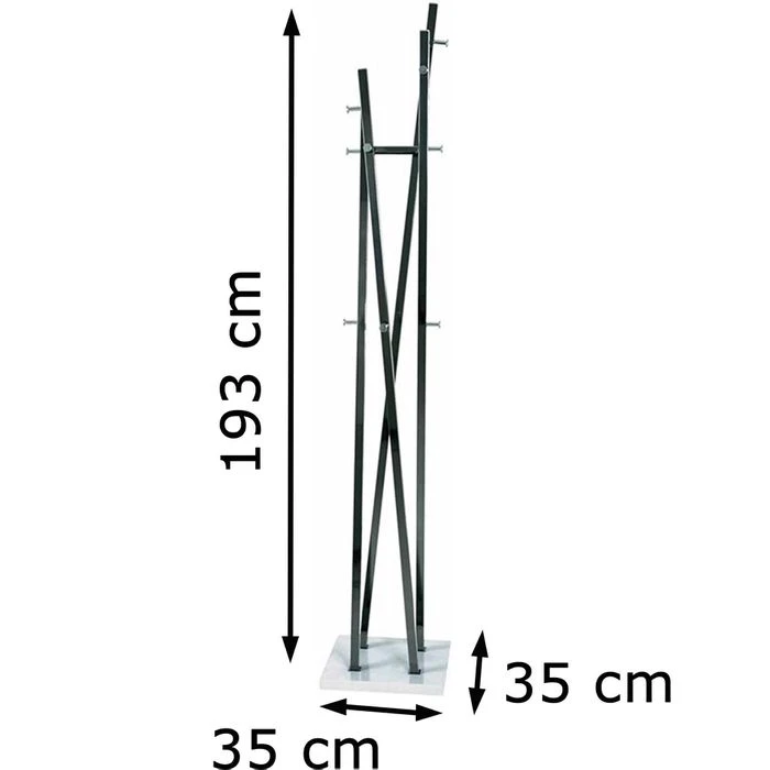sonstiges: aus dunkel verchromtem Metall, mit 12 verchromten Kleiderhaken, standsicher durch schweren Standfuß aus MDF in hochglanz weiß