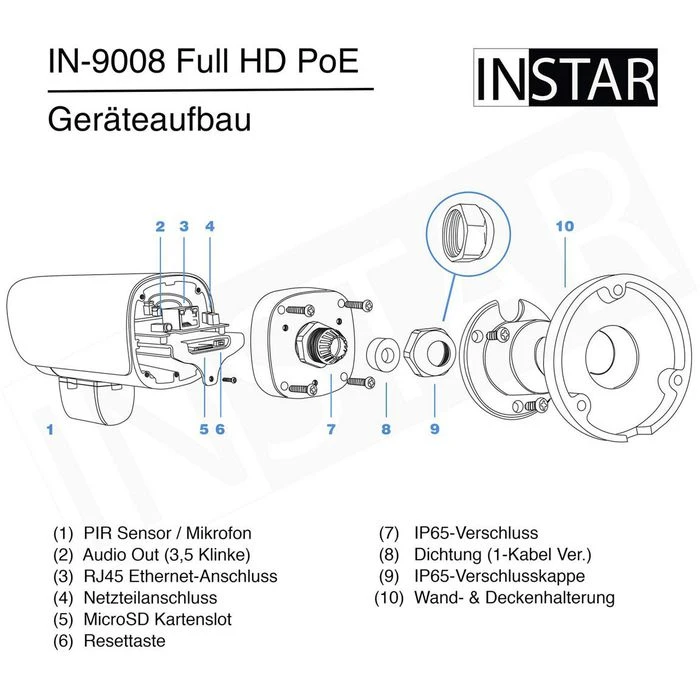 Lieferung: inkl. Wand- und Deckenhalterung mit Kugelgelenk, Netzteil, Netzwerkkabel, Dichtungsringe, Befestigungsmaterial, 16 GByte microSD-Karte