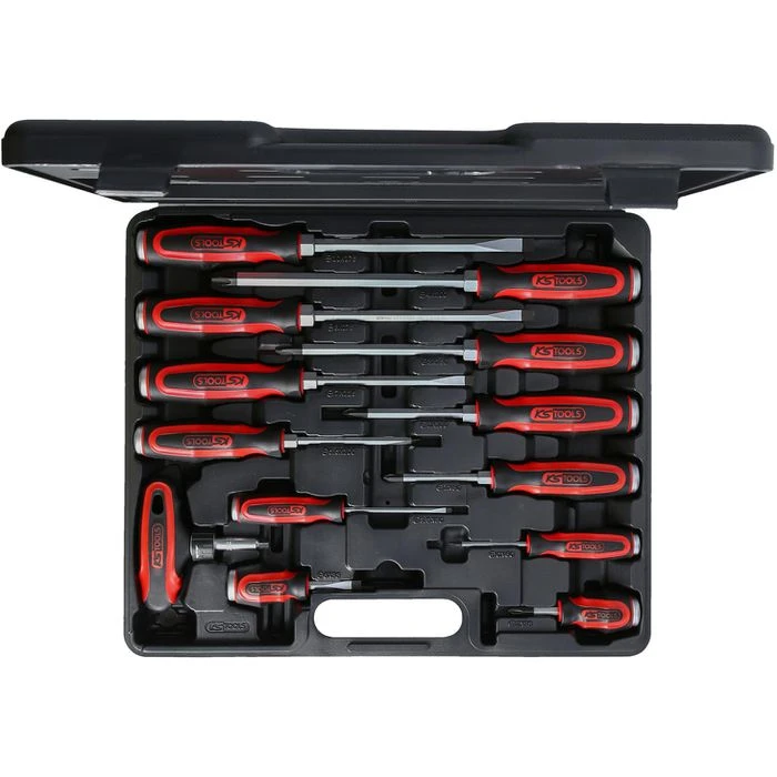Lieferung: inkl. 13 Teilen (6 Schlitz-, 6 Kreuzschlitz-Schraubendreher (PH), T-Griff-Umschaltknarre), Kunststoffkoffer