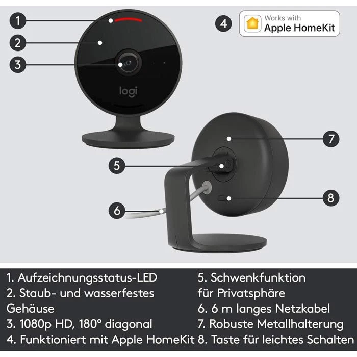 sonstiges: wetterfest (IP64), beweglicher Kamerakopf zum manuellen Schwenken, Neigen und Drehen, Zugriff und Cloud-Speicher über Apple HomeKit