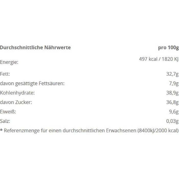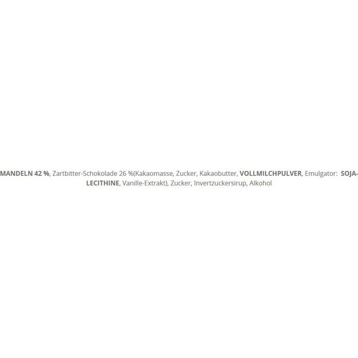 MANDELN 42 %, Zartbitter-Schokolade 27 % (Kakaomasse, Zucker, Kakaobutter, VOLLMILCHPULVER, Emulgator: SOJA-LECITHINE, Vanille-Extrakt), Zucker, Invertzuckersirup, Alkohol
