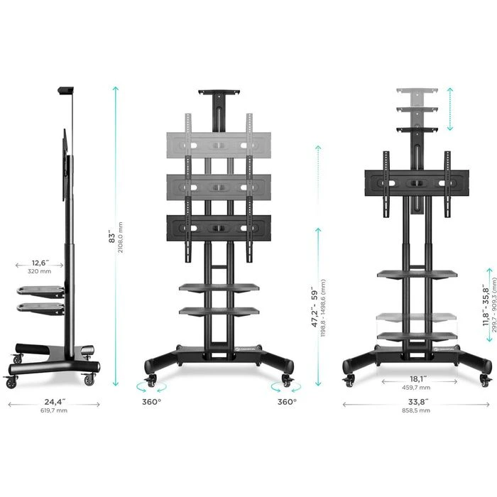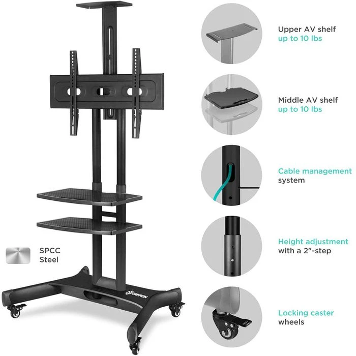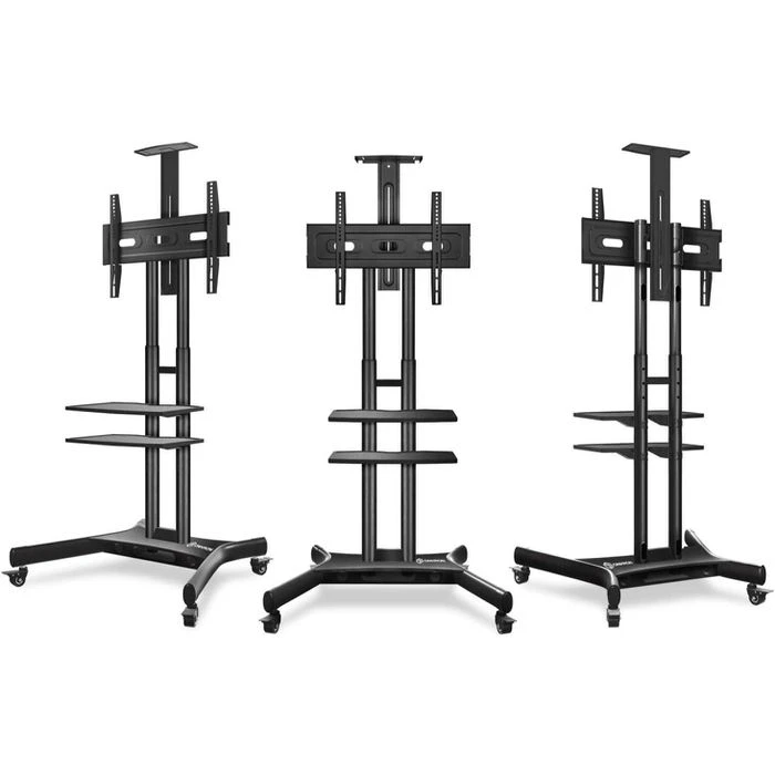 sonstiges: mit verdeckter Kabelführung an der Rückseite, höhenverstellbare Kamerahalterung, höhenverstellbare Ablagen für AV-Geräte bis 4,5 kg (51 x 32 cm), feststellbare Laufrollen