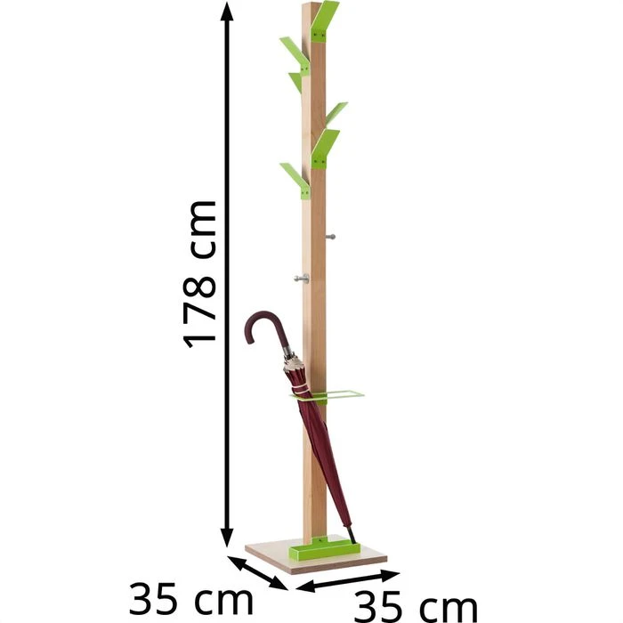 sonstiges: 6 farbige Kleiderhaken aus robustem Polystyrol und 2 zusätzliche Haken aus verchromtem Stahl, Massivholz-Ständer transparent lackiert, Schirmhalter mit Tropfmulde, standsicher durch wasserfesten Standfuß aus Sperrholz
