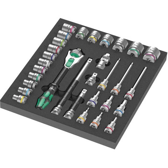 Lieferung: inkl. 31 Teile (1x Speed-Knarre, 2x Verlängerung, 1x Kardangelenk, 1x Wobble-Verlängerung, 17x Steckschlüssel, 9x Bitnüsse) mit Schaumstoffeinlage