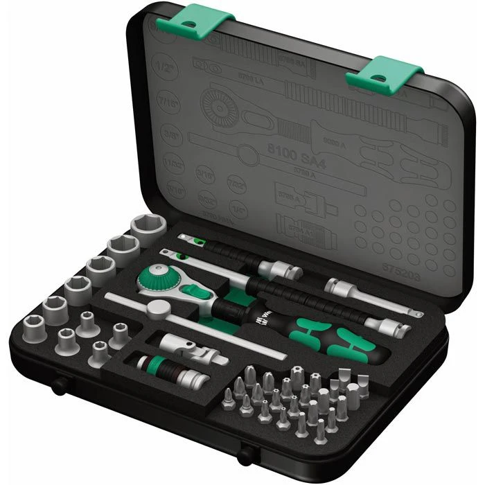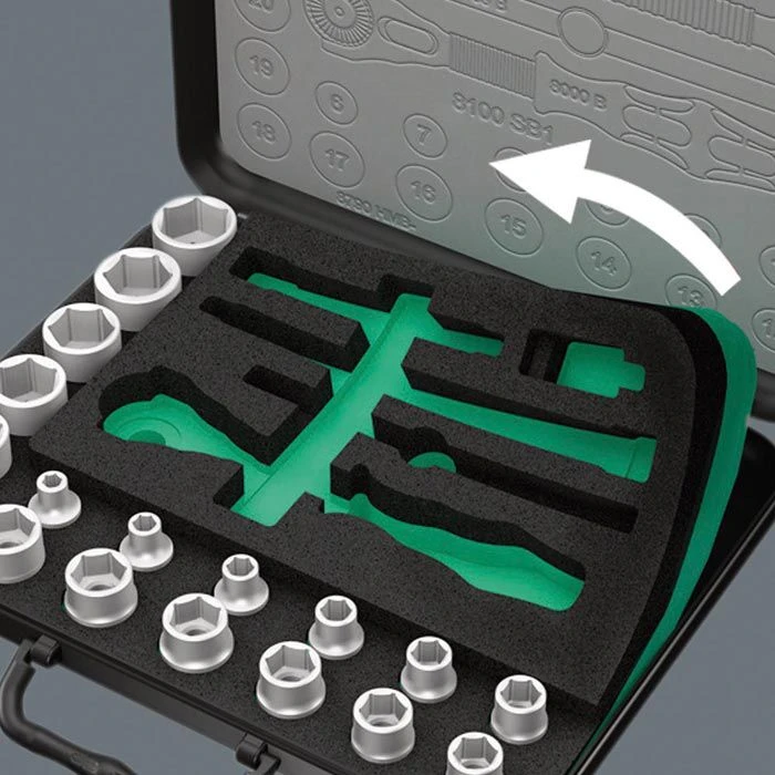 sonstiges: mit Werkzeugfinder Take it easy, sprich Farbkennzeichnung nach Größen, stabiler Metallkoffer mit zweifarbiger Schaumstoffeinlage, Knarrenkopf ist frei schwenkbar und kann durch Schiebeschalter in jeder Fixierungsposition verriegelt werden, über Rändelrad in jeder Position für Rechts-/Linksgang umschaltbar, 5 Knarrentypen in einer Knarre