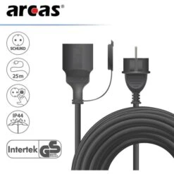 Arcas Strom-Verlängerungskabel, 25m, Schutzkontakt, Außen IP44, Schwarz