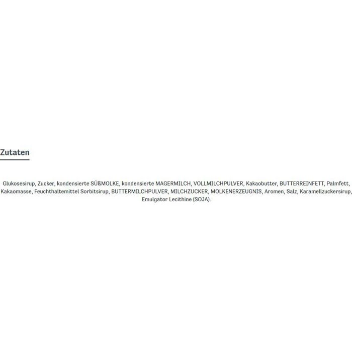 Zutaten: Glukosesirup, Zucker, Palmfett, kondensierte MAGERMILCH, Feuchthaltemittel Sorbitsirup, Kakaomasse (5,4%), VOLLMILCHPULVER, SAHNE (2,9%), kondensierte SÜSSMOLKE, BUTTER (1,9%), MOLKENERZEUGNIS, MILCHZUCKER, BUTTERMILCHPULVER, Emulgator Lecithine (SOJA), Salz, Rohrzuckersirup, Aroma.